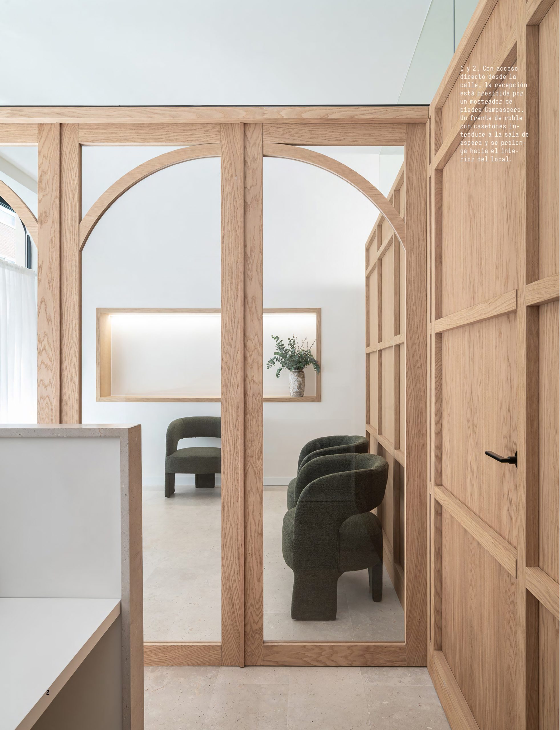 El frente de roble con casetones aporta calidez y continuidad visual desde la recepción hasta la zona de espera, mientras la piedra natural se utiliza en el mostrador y pavimento, transmitiendo una sensación de solidez y serenidad.