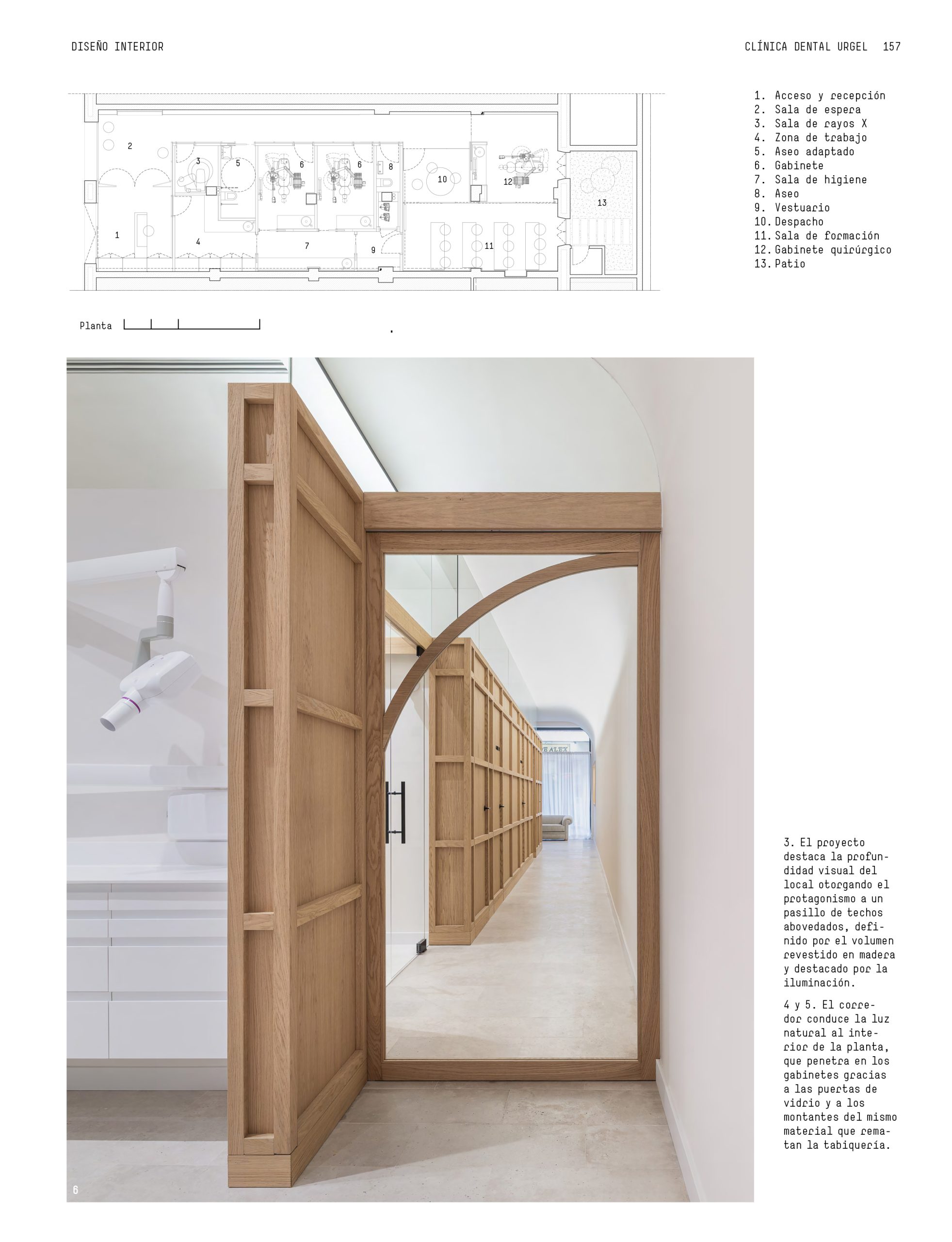 Desde la calle, el pasillo abovedado y los frentes de madera invitan a entrar en un espacio que se percibe cálido, sereno y profesional. Una atmósfera pensada para mejorar la experiencia del paciente y dignificar el entorno sanitario.