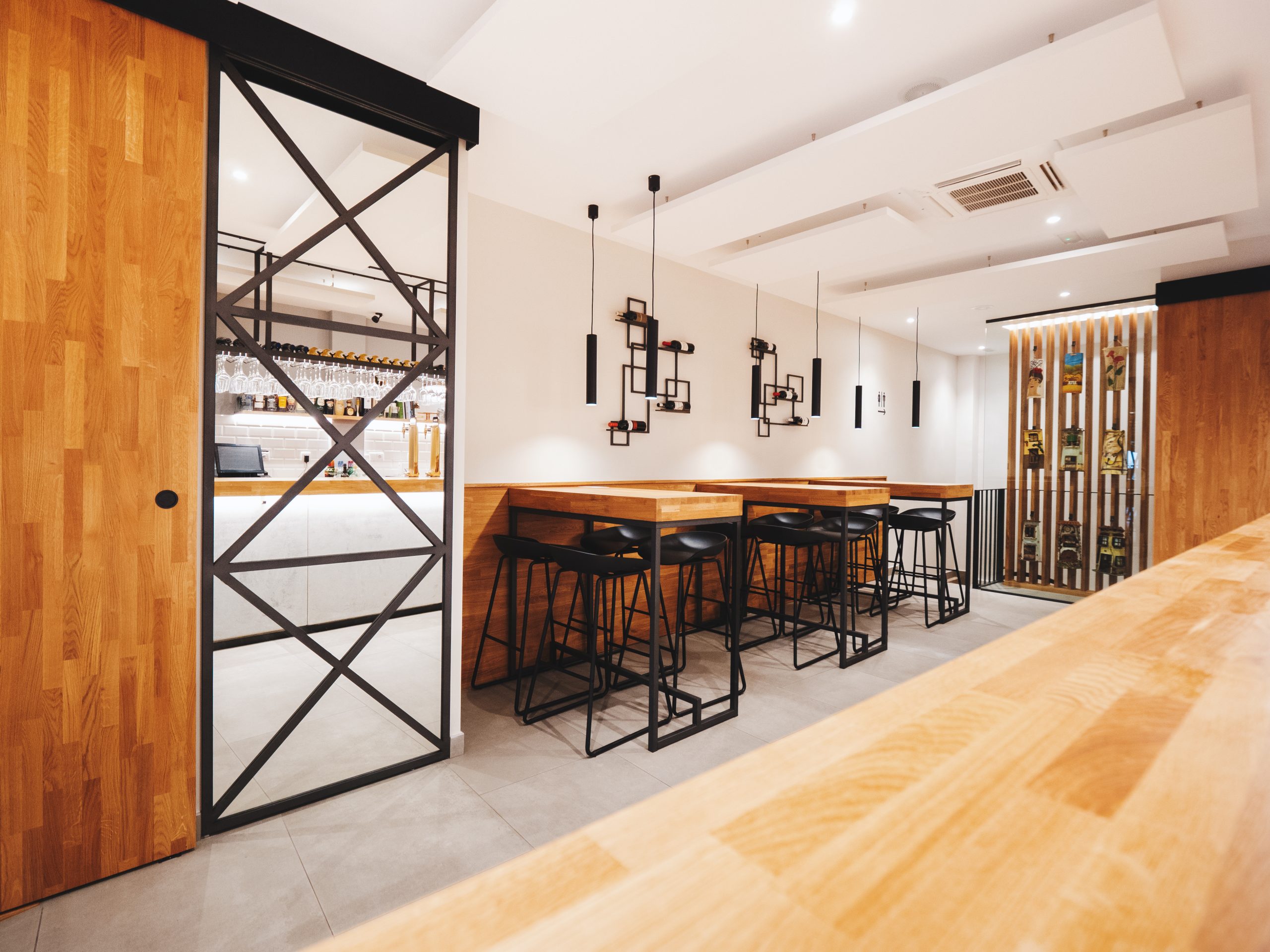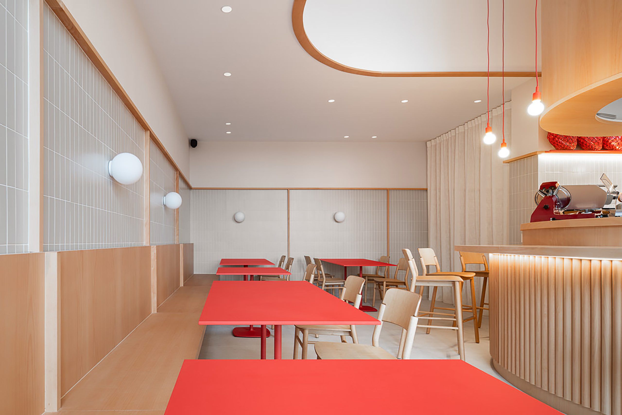 El proyecto se articula en torno a una barra cilíndrica de doble altura que organiza el espacio y fomenta la interacción directa entre cliente y experto. Concebida como un teatro gastronómico, esta pieza central convierte al charcutero en narrador y ejecutor, mientras el diseño general apuesta por la claridad, la amplitud y una estética depurada que prioriza la experiencia sensorial sin artificios.