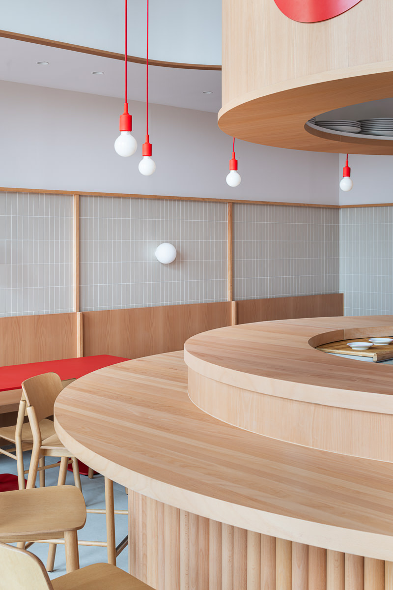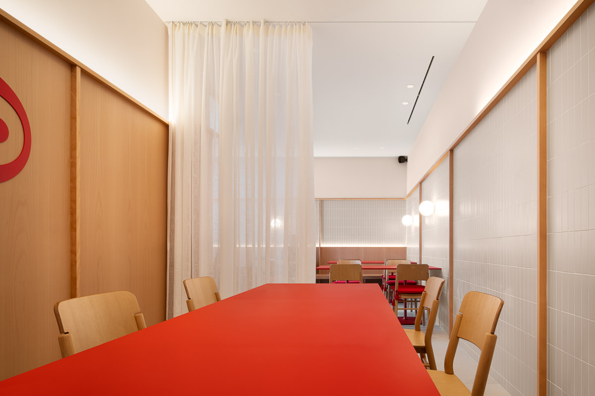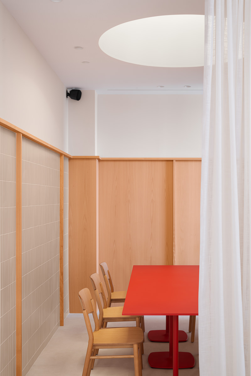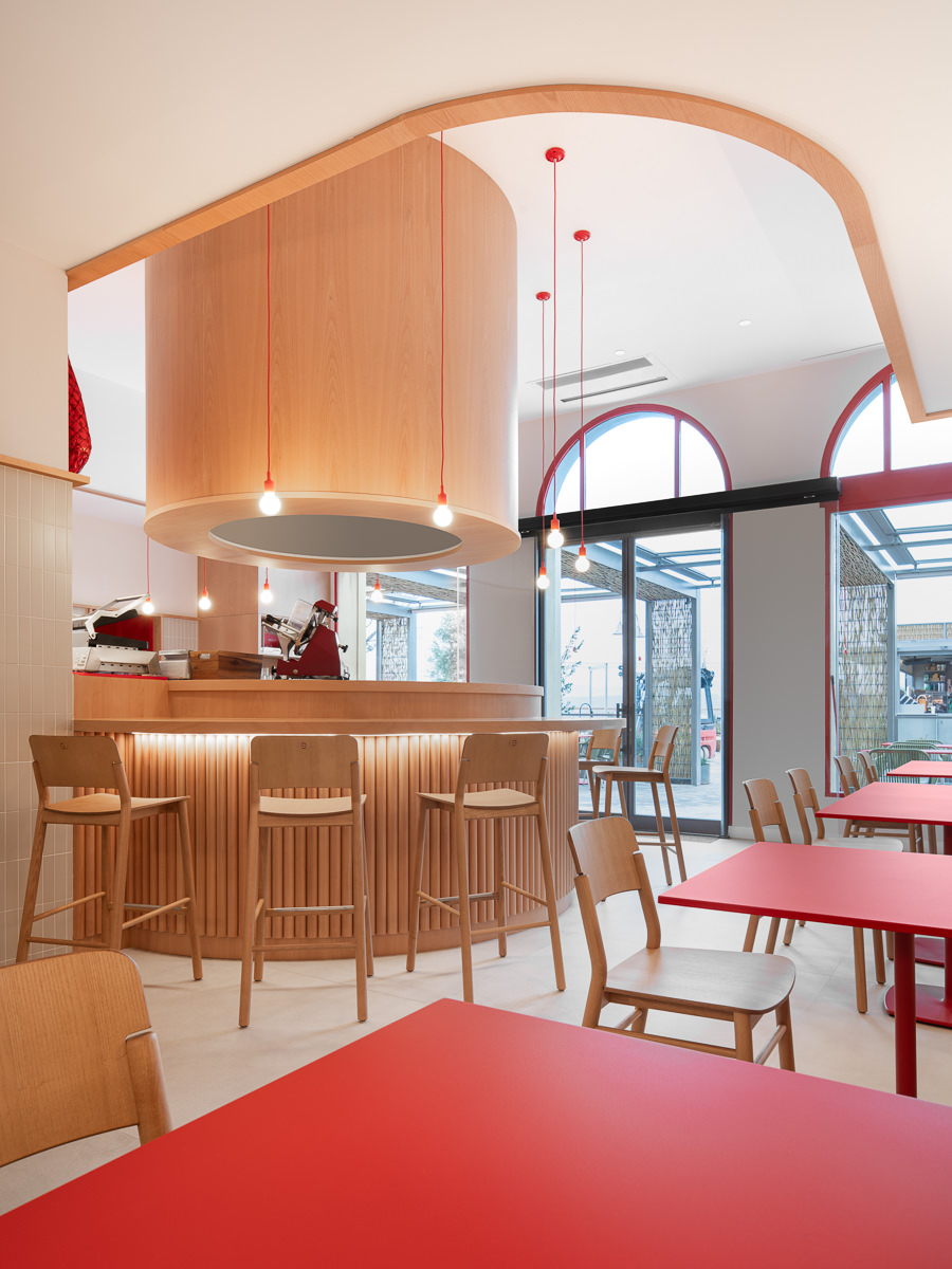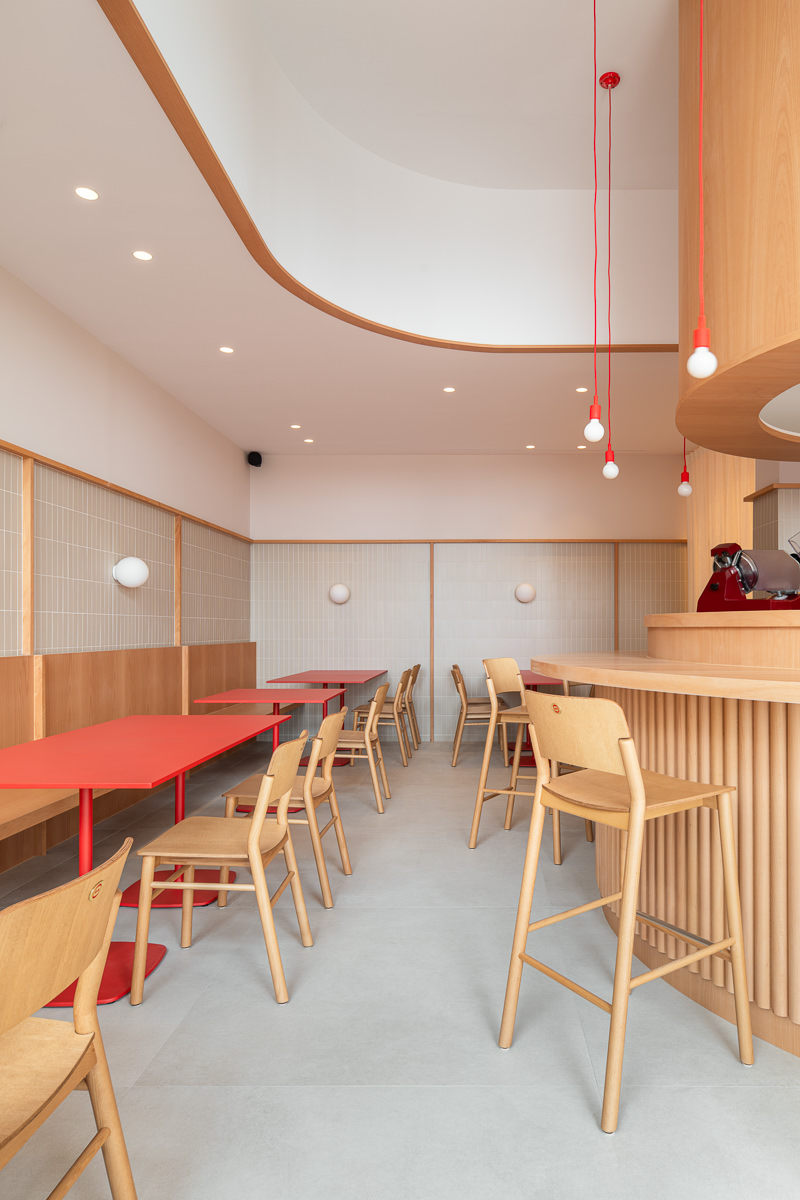 El proyecto se articula en torno a una barra cilíndrica de doble altura que organiza el espacio y fomenta la interacción directa entre cliente y experto. Concebida como un teatro gastronómico, esta pieza central convierte al charcutero en narrador y ejecutor, mientras el diseño general apuesta por la claridad, la amplitud y una estética depurada que prioriza la experiencia sensorial sin artificios.