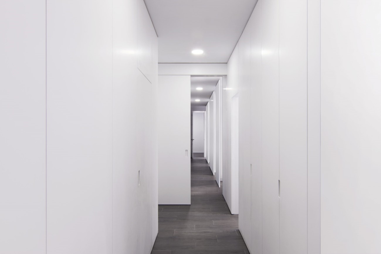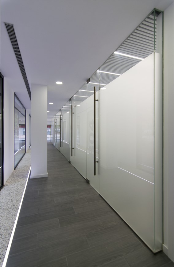 El interior se unifica mediante un falso techo de lamas blancas y tabiques con remates en vidrio, creando un espacio amplio y luminoso. Un mueble continuo oculta zonas técnicas como aseos, archivo e instalaciones, manteniendo un diseño limpio y funcional.