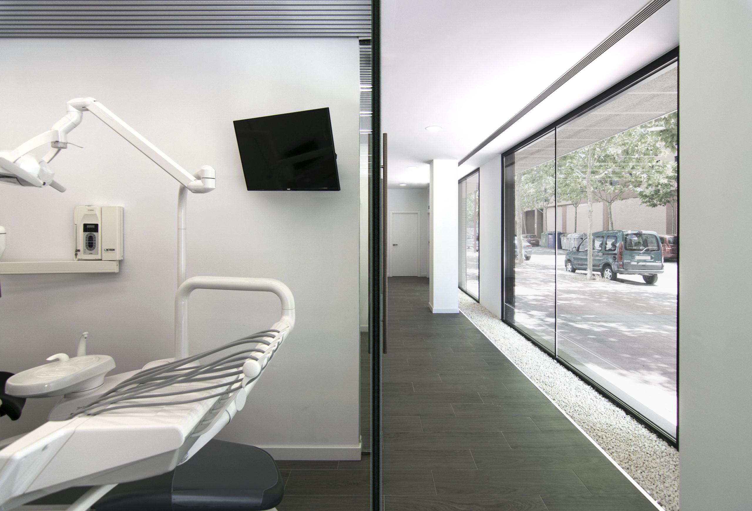 La reforma integral de clínica dental promovida por la Dra. Mª Luisa Hernansanz ha sido diseñada para maximizar la luz natural y lograr una integración armoniosa con el entorno exterior. Gracias a sus dos fachadas completamente abiertas, esta clínica dental