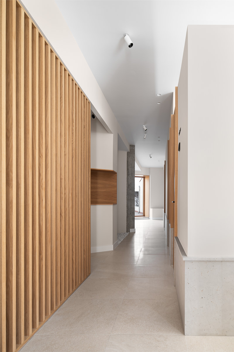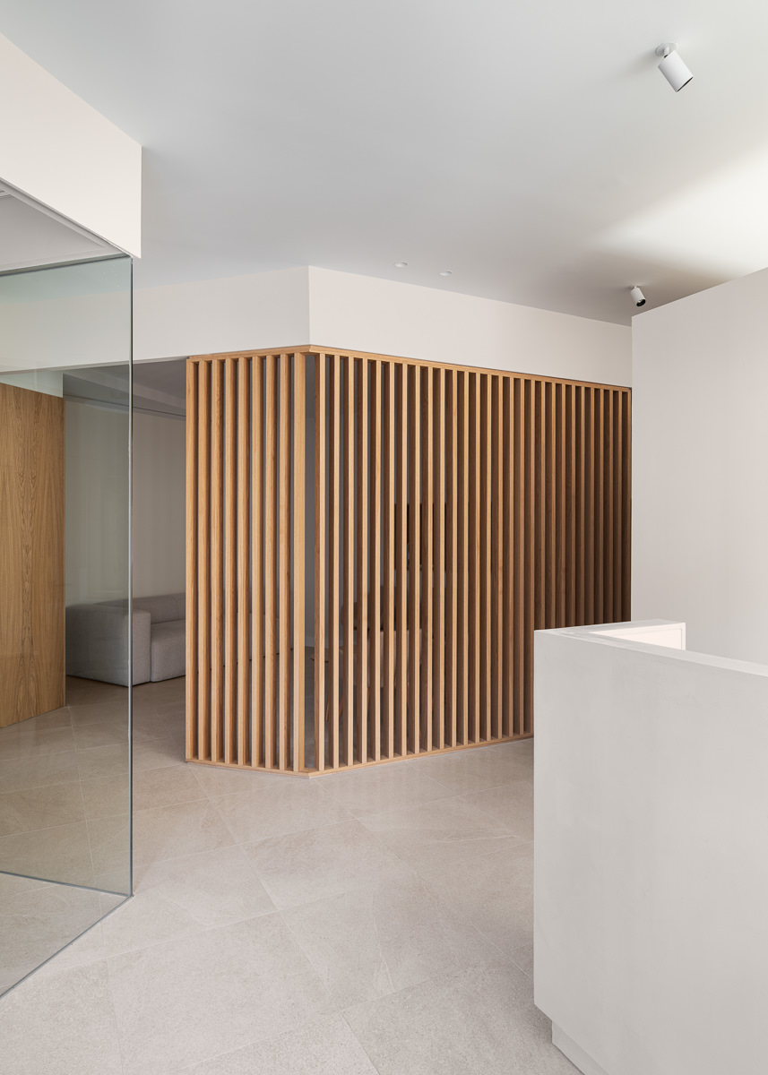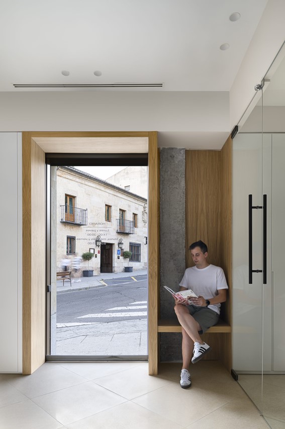 Estudio de Arquitectura especialista en arquitectura sanitaria en Salamanca, organizan el espacio en dos zonas: pública y privada. Al entrar, un frente de roble oculta el aseo y un archivo, enmarcando una acogedora sala de espera y un despacho acristalado.