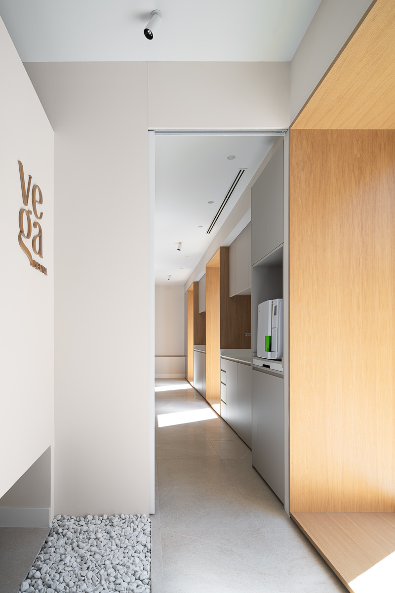 El diseño de esta clínica dental moderna está basado en una estructura central curva que optimiza la distribución de las áreas clínicas y administrativas, mejorando la circulación y el flujo de trabajo del equipo odontológico. Esta planificación espacial eficiente garantiza