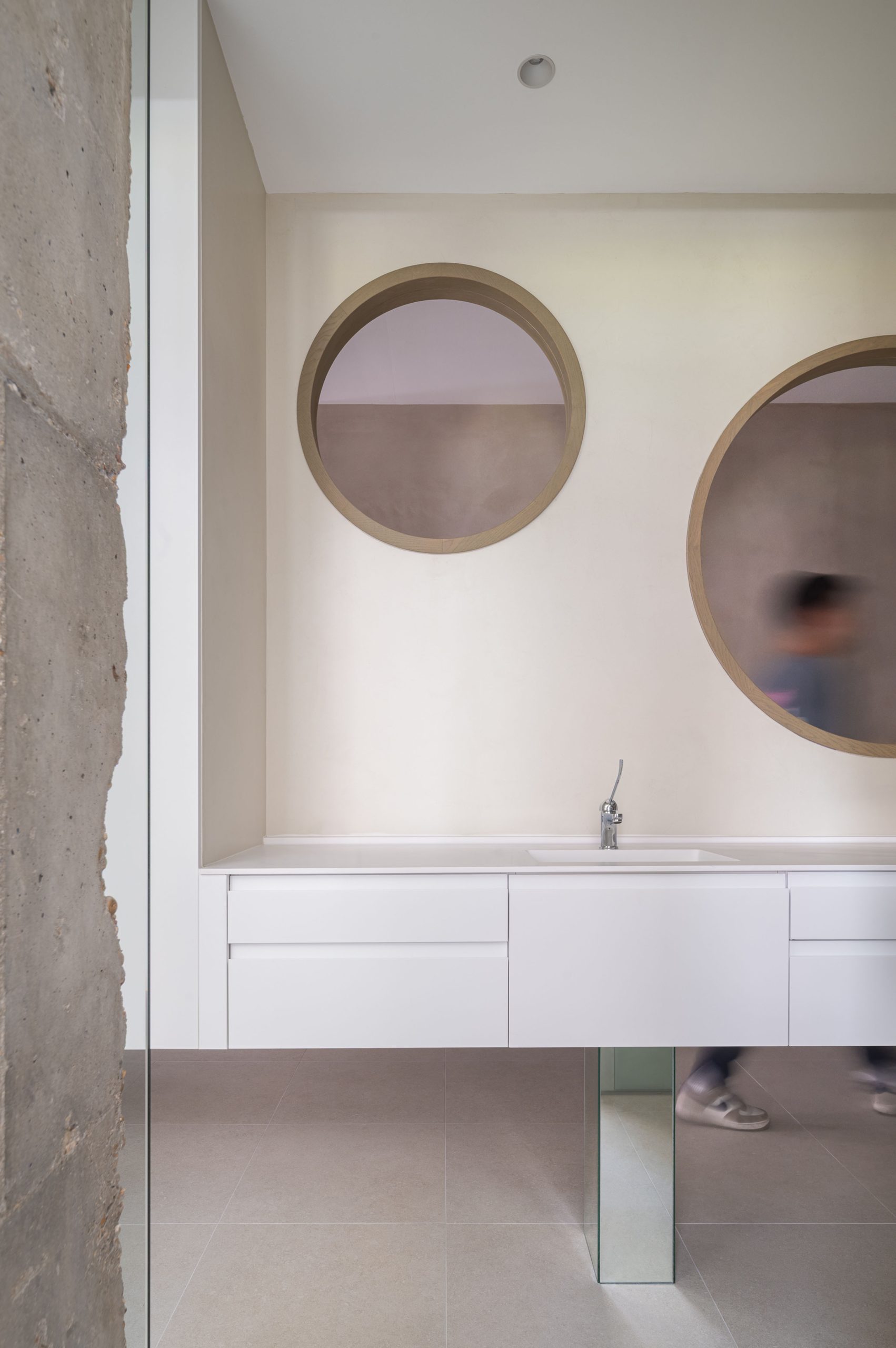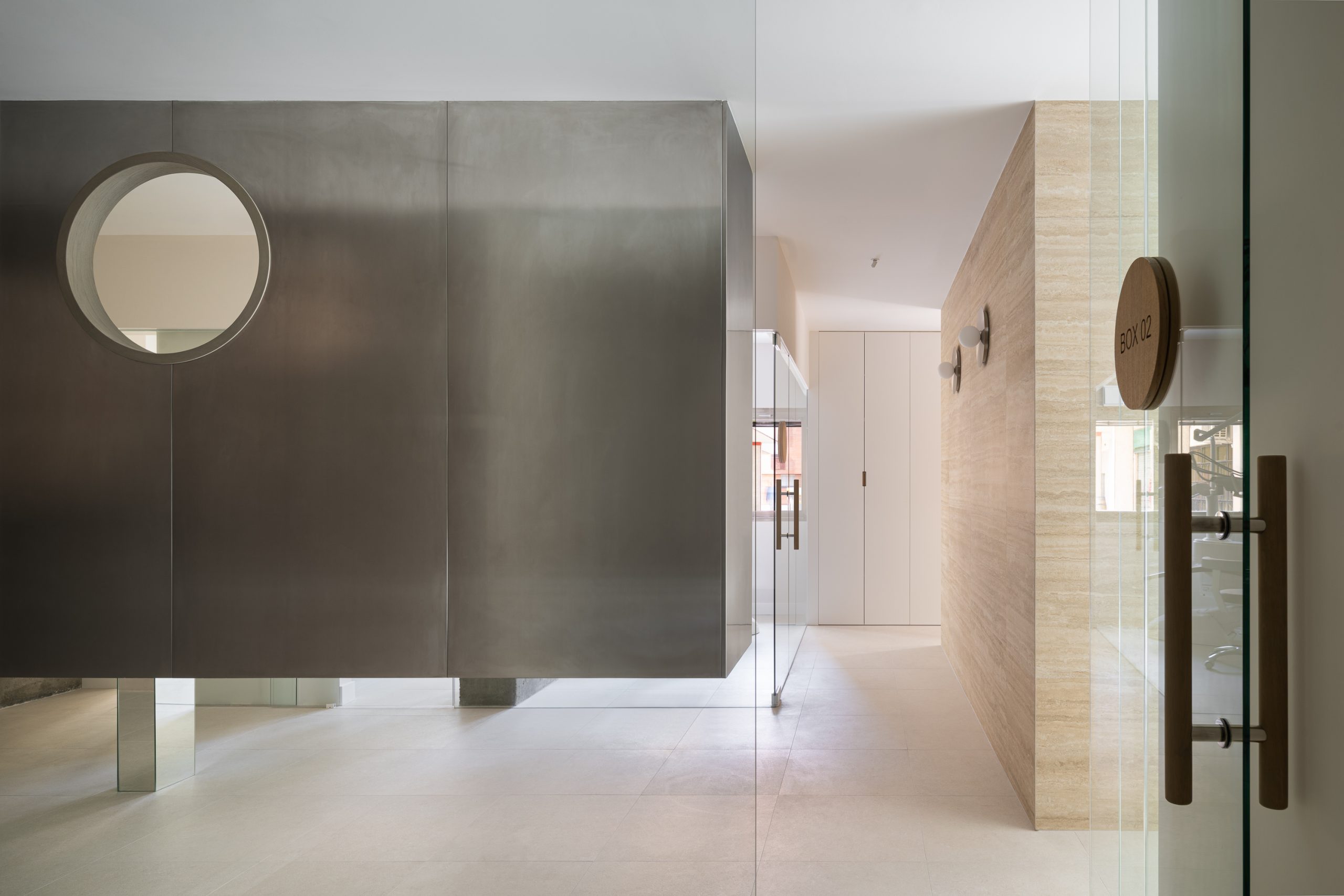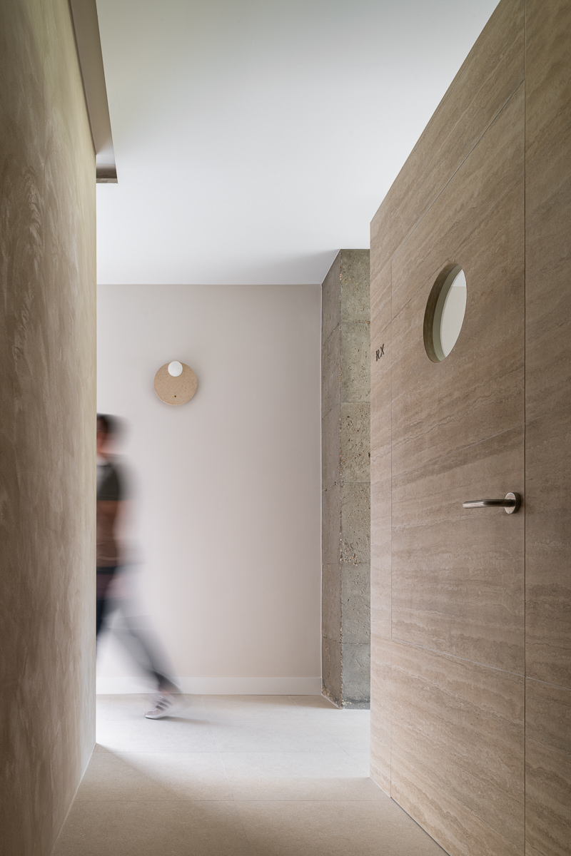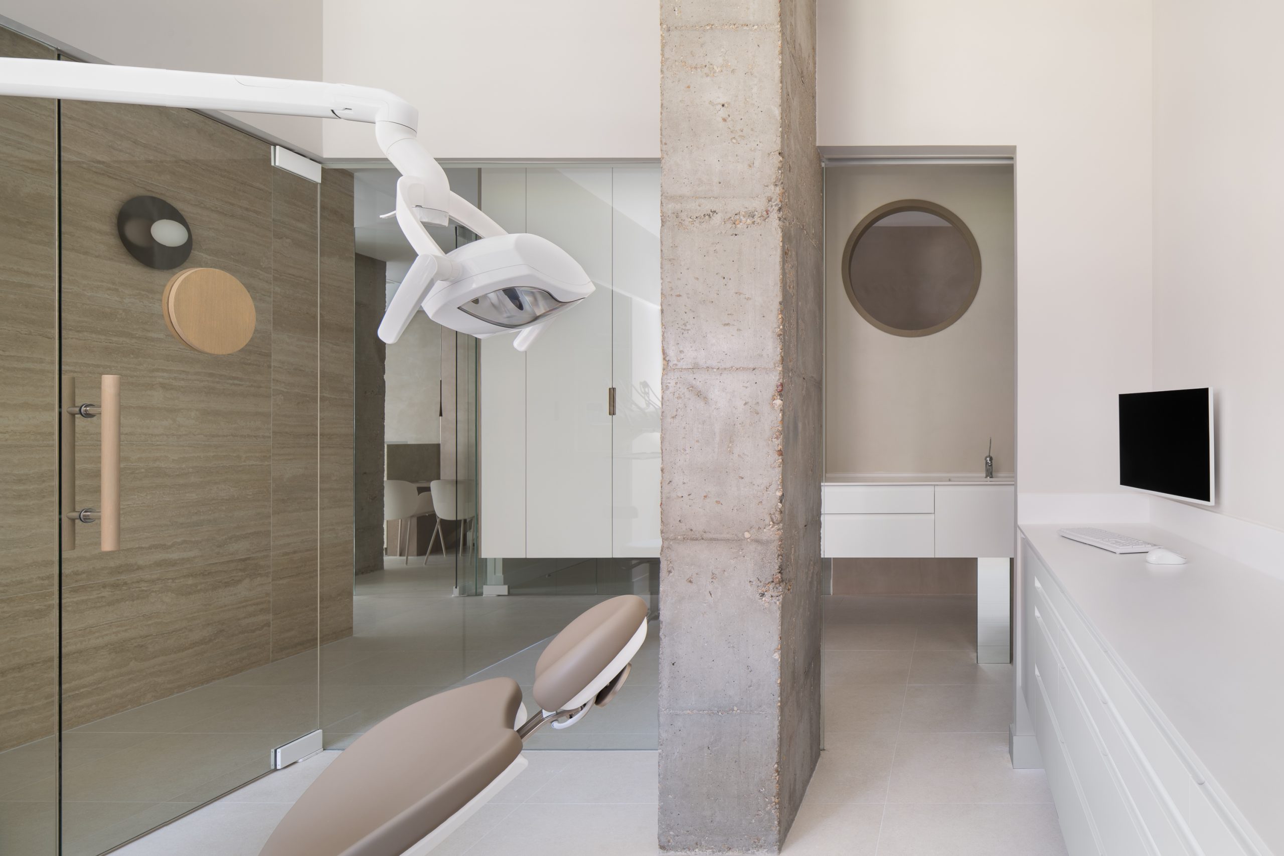 El elemento central de la clínica la esterilización. Más que un componente funcional, este bloque se convierte en protagonista arquitectónico: ventanas circulares permiten un juego de “visto y no visto” entre pacientes y profesionales, generando dinamismo y curiosidad. Además, integra discretamente la renovación y retorno del aire climatizado, ocultando rejillas y conductos.