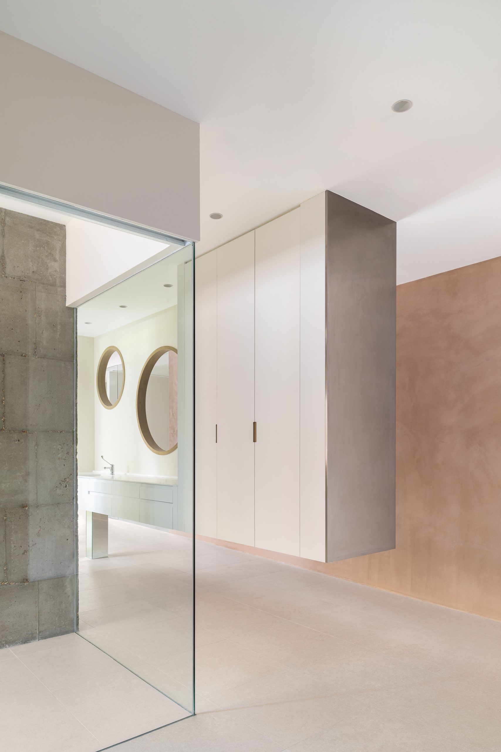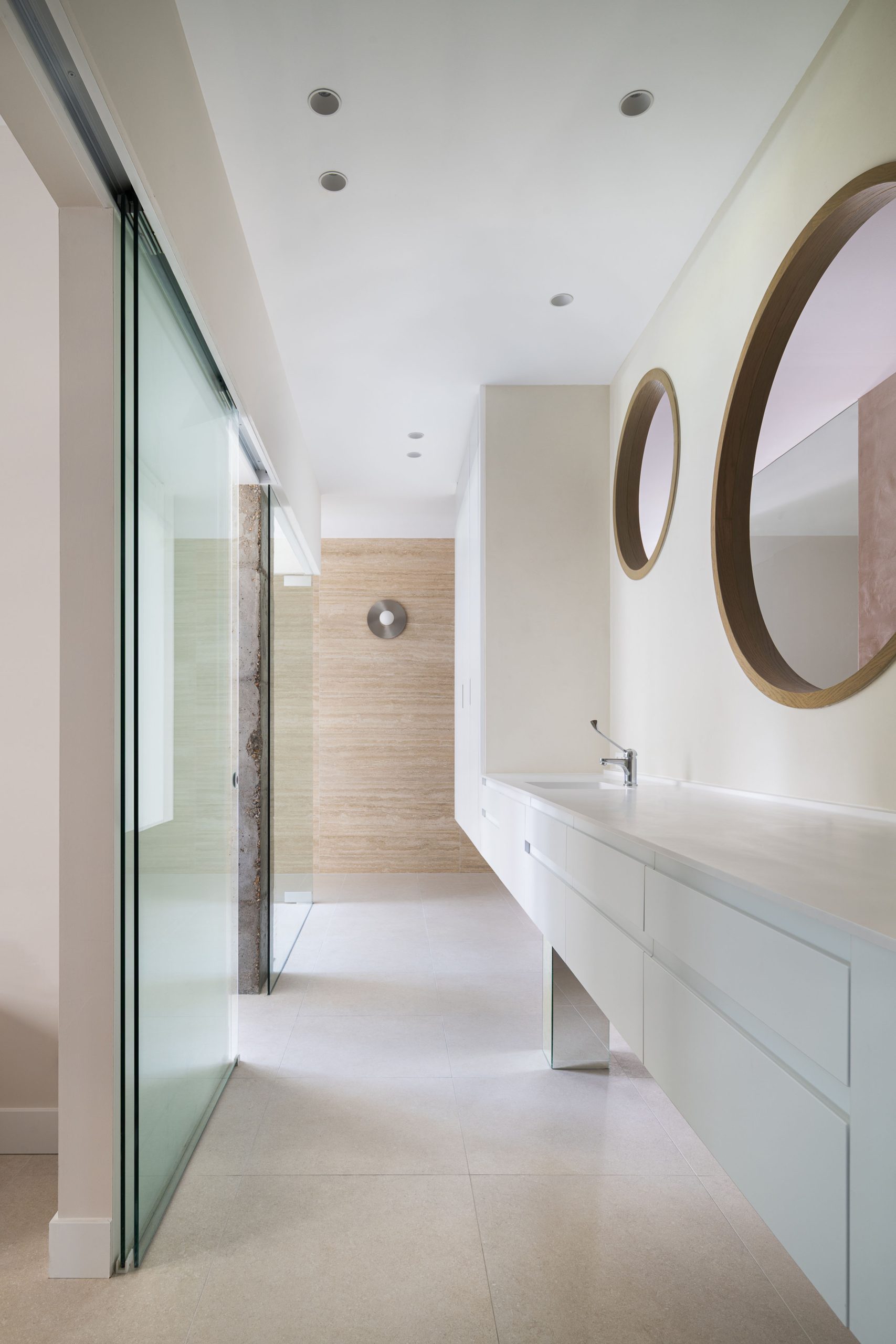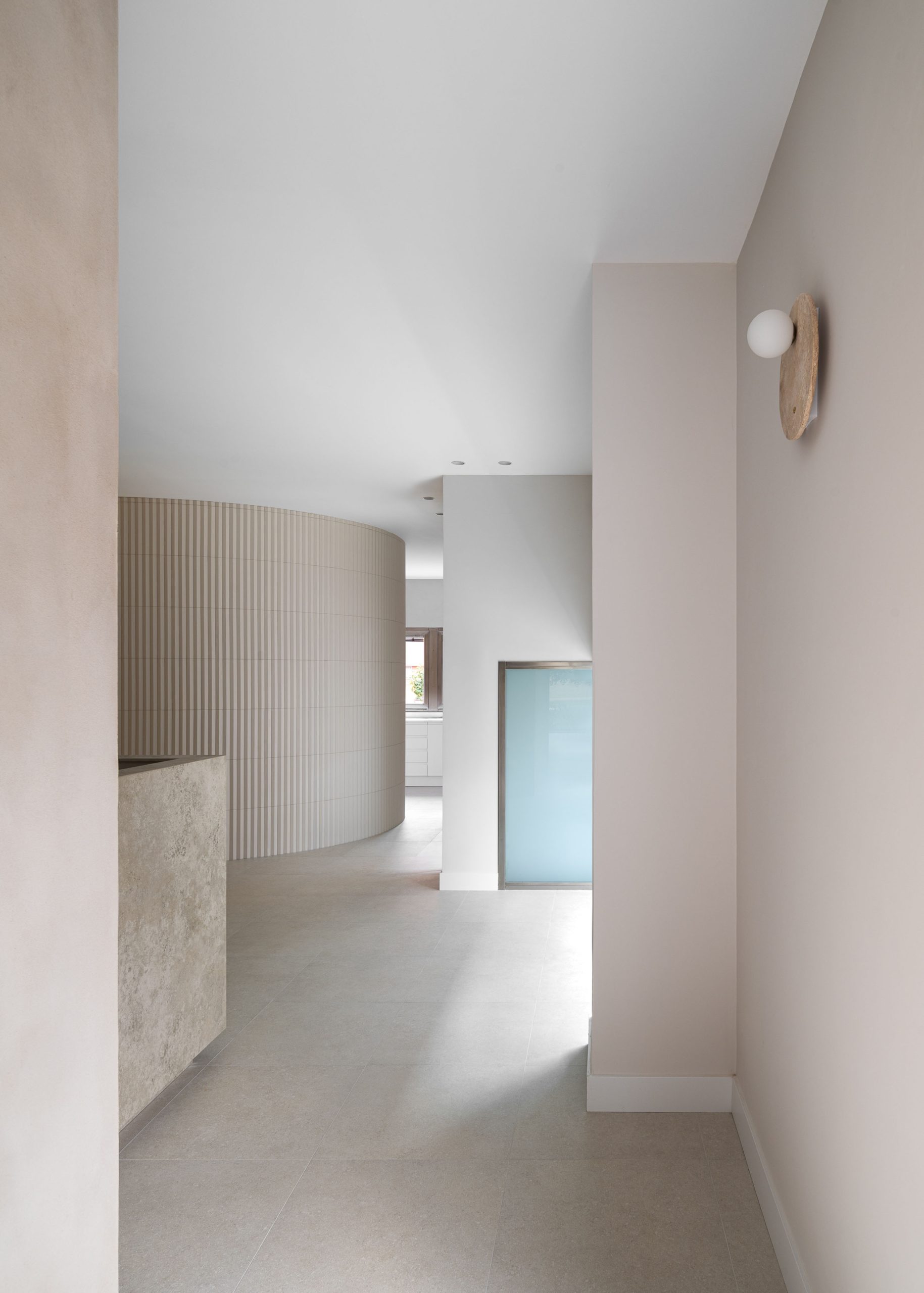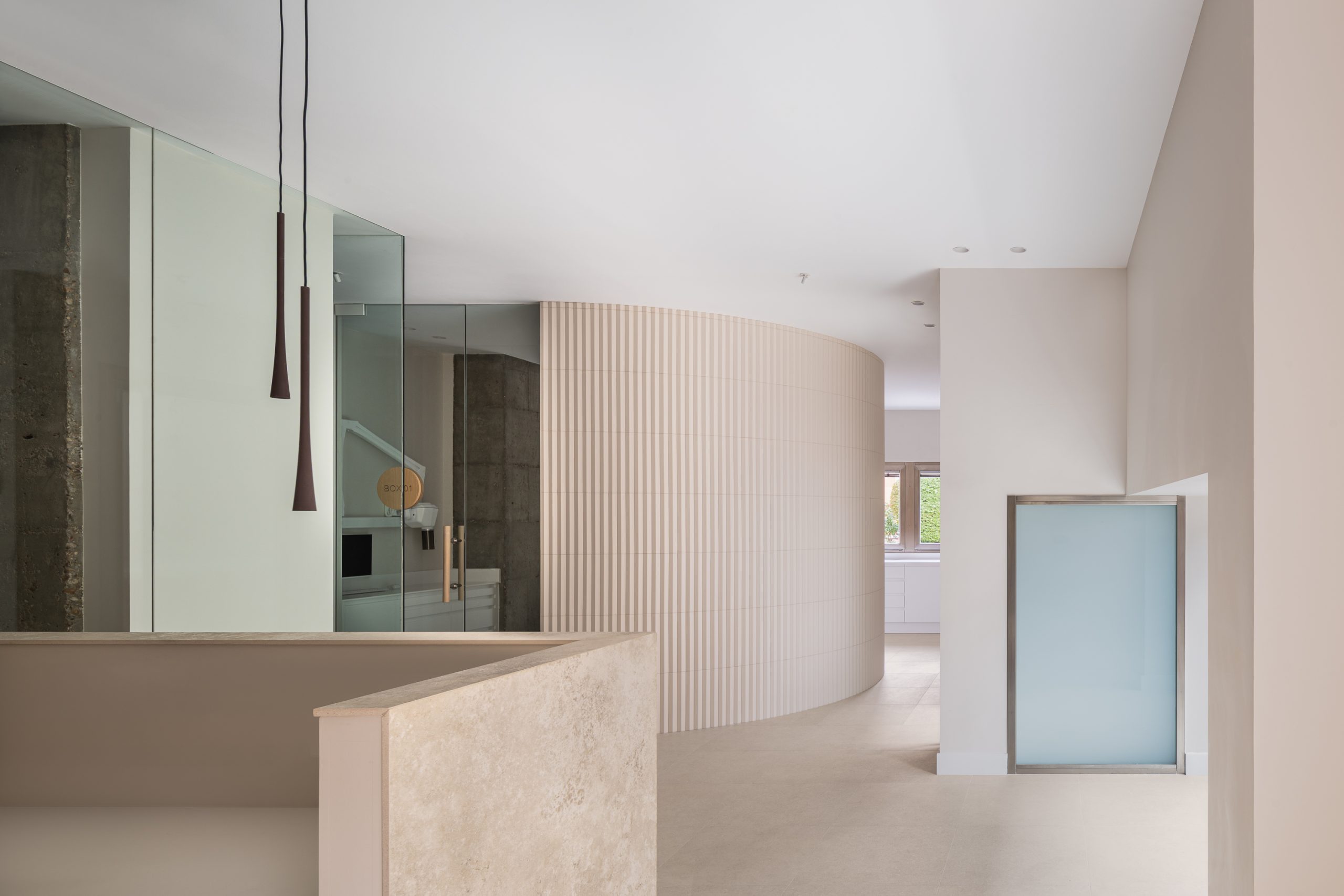 El elemento central de la clínica la esterilización. Más que un componente funcional, este bloque se convierte en protagonista arquitectónico: ventanas circulares permiten un juego de “visto y no visto” entre pacientes y profesionales, generando dinamismo y curiosidad. Además, integra discretamente la renovación y retorno del aire climatizado, ocultando rejillas y conductos.