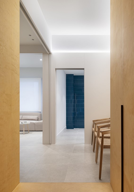 A pesar de las dimensiones limitadas, se ha logrado integrar de forma eficiente todas las áreas necesarias. La propuesta se distingue por su flexibilidad espacial, permitiendo adaptar el local según las necesidades del momento. Un cerramiento abatible permite unir los gabinetes en un único espacio amplio para terapias grupales, mientras que dos puertas correderas modulan la sala de espera, integrándola si es necesario al área de trabajo.
